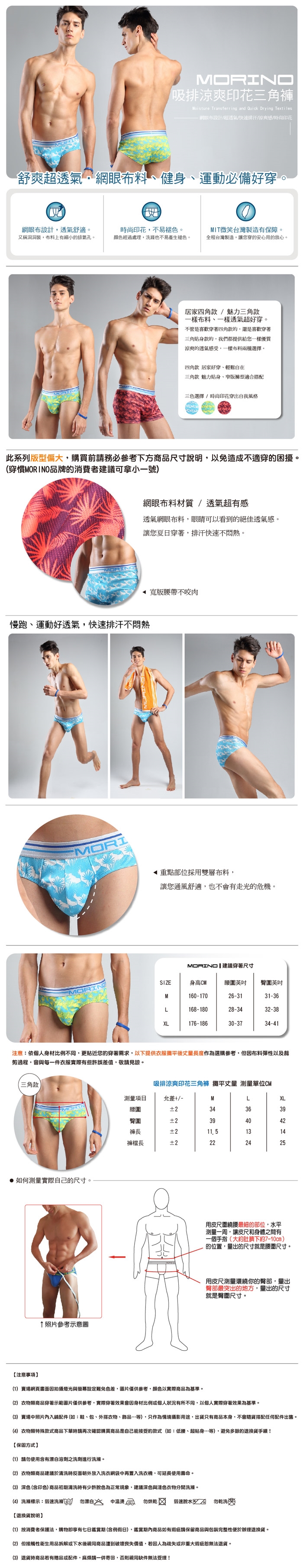 網眼款式 透氣舒適 多色亮眼 叢林風情 輕鬆穿著 立體剪裁 展現男性獨特魅力 品牌 MORINO款式 合身四角內褲腰頭 中低腰顏色 白色系 藍色系尺寸 M L XL主材質 聚酯纖維 售價:149
